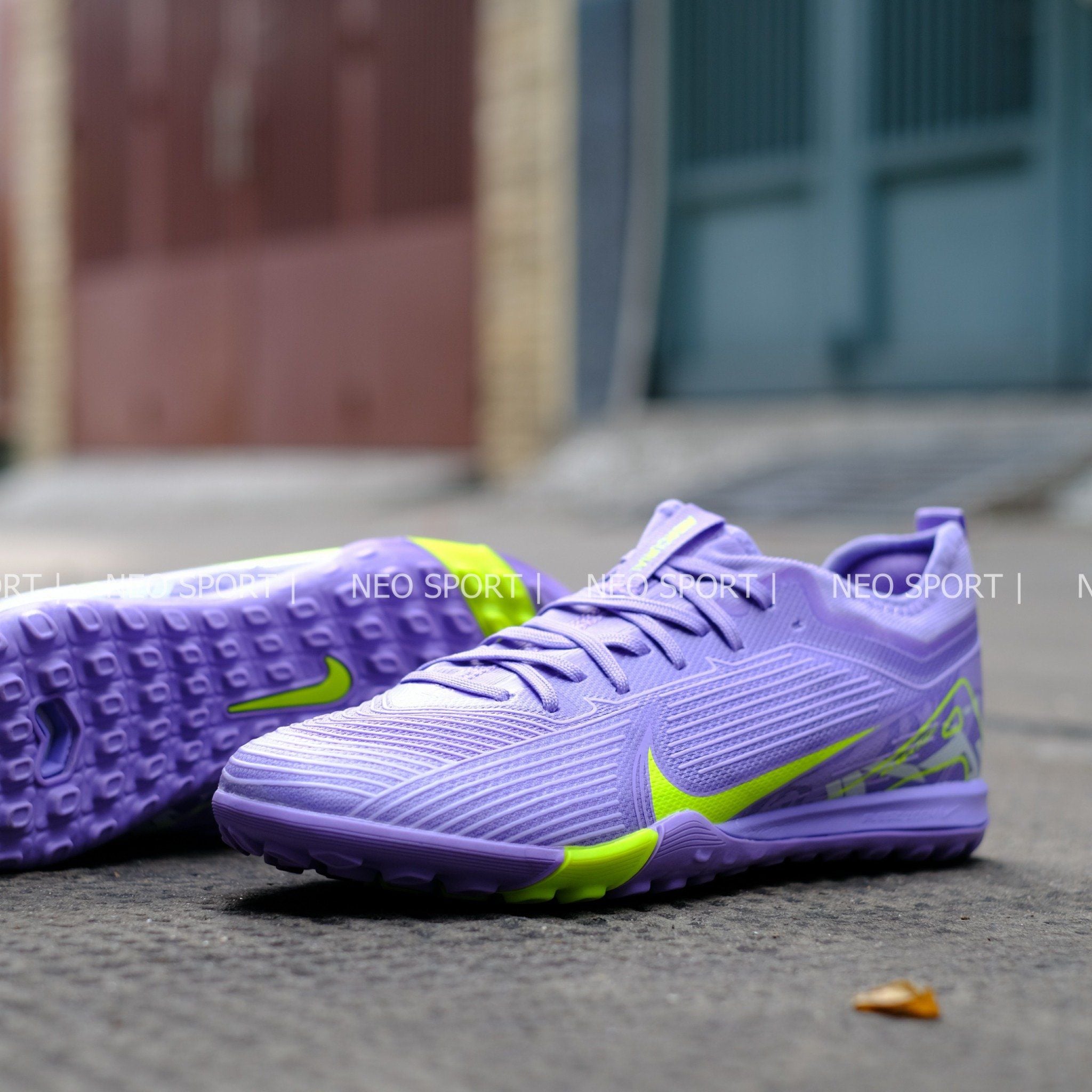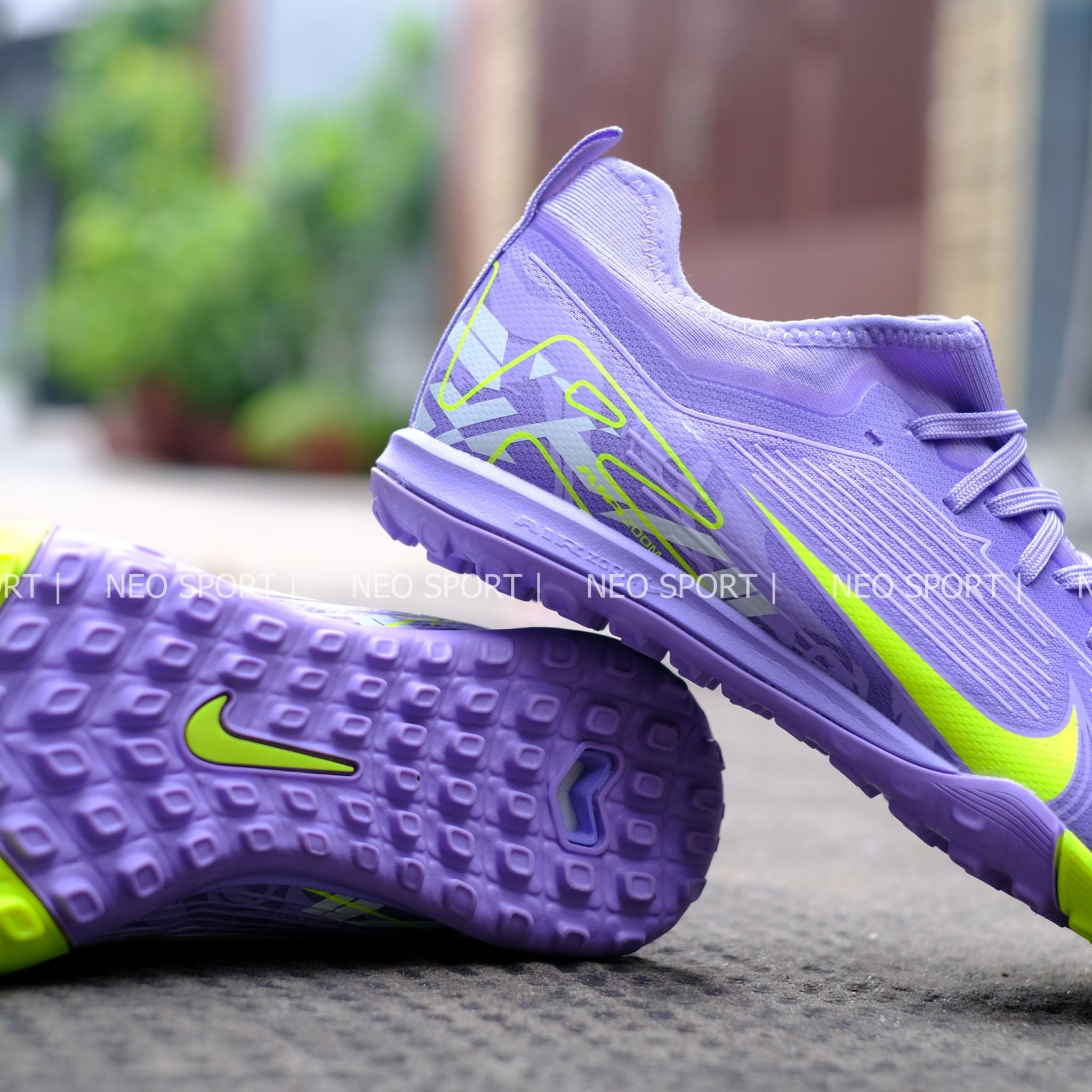 Toàn thân giày phủ màu tím pastel ánh lavender cực kỳ dịu mắt, mới lạ và nổi bật trên sân bóng.